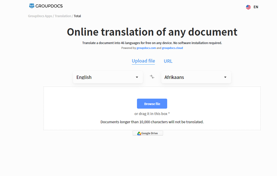 第一步,打开GroupDocs Translation翻译网页,拖拽斯洛伐克语文档到上传区。